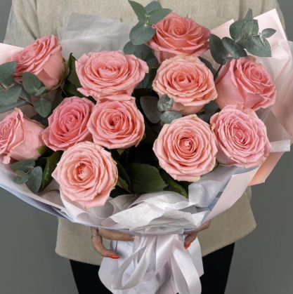 Буукет 11 розовых роз с эвкалиптом | Купить с доставкой в Орехово-Зуево