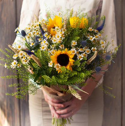 Летний букет из полевых цветов. Удивительное сочетание ромашек, подсолнухов, зеленого гринбела, синего эрингиума и пшеницы.