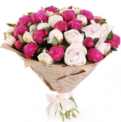 Шикарный букет из 39 крупных пионов бордового и белого цвета. Такой букет останется впамяти на долго.