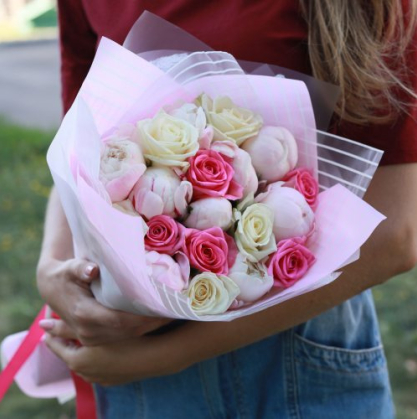 Букет из красивых роз розового и белого цвета в сочетании с пионами. Очень красивая композиция "Сластена" для чувственных натур.