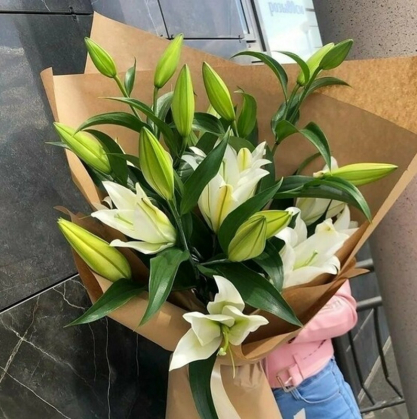 Небольшой букетик из 3 веток белой лилии. Упаковка: крафт-бумага.