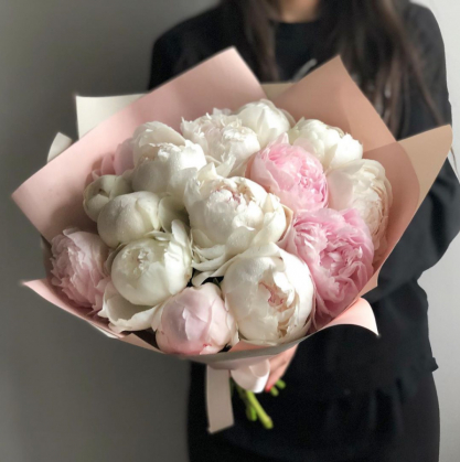 Букет из белых и розовых пионов в стильной упаковке. Композиция из розовых и белых бутонов подойдет для торжественных случаев.