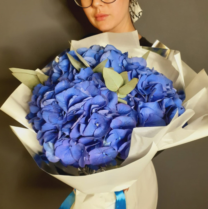Стильный букетик из трех веток синей гортензии в упаковке. По вашему желанию цвет упаковки можно изменить.