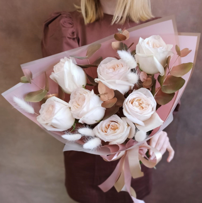 Букет из пионовидных роз White O'Hara, позолоченного эвкалипта и лагуруса будет иметь элегантный и изысканный вид. Розы White O'Hara имеют большие, крепкие бутоны, которые придадут букету роскоши и красоты. Длинные стебли лагуруса добавят букету легкости и изящности. В целом, этот букет будет иметь изысканный и элегантный вид, который будет подходить для специальных мероприятий и дарения кому-то особому.