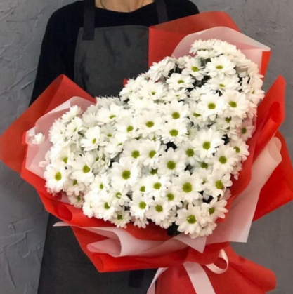Большой букет из 15 веток белой хризантемы в виде сердца. Букет собирается на проволочном каркасе.