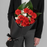 Букет состоит из красной гвоздики и белой эустомы. Добавлены листь аспидистры.