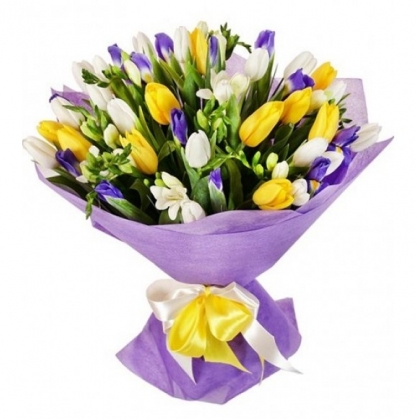 Букет "Три желания" из тюльпанов, ирисов и фрезии | Купить в Орехово-Зуево